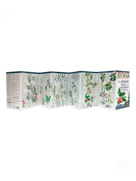 Còmoda guia en un format de paper plastificat desplegable. Inclou les 101 espècies d’arbusts, lianes i altres enfiladisses que per la seva popularitat, abundància o altres singularitats cal conèixer. A cada làmina hi trobem il·lustrades entre 6 i 8 espècies diferents, acompanyades d’un petit text i unes icones amb informació complementària per facilitar-ne la localització i identificació. Les espècies apareixen a escala aproximada dins la làmina, excepte quan ho fan dins d’un cercle, que mostra un detall. Hi apareix la notació científica i el nom en català, castellà i anglès