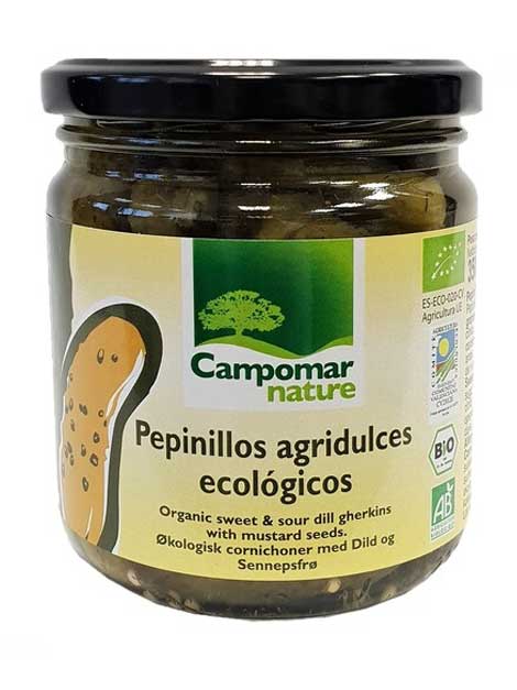 Ingredients: Cogombrets*, vinagre*, aigua, xarop d’agave*, sal marina, llavor de mostassa (groga)*, anet*, cebes* i pebre vermell*.